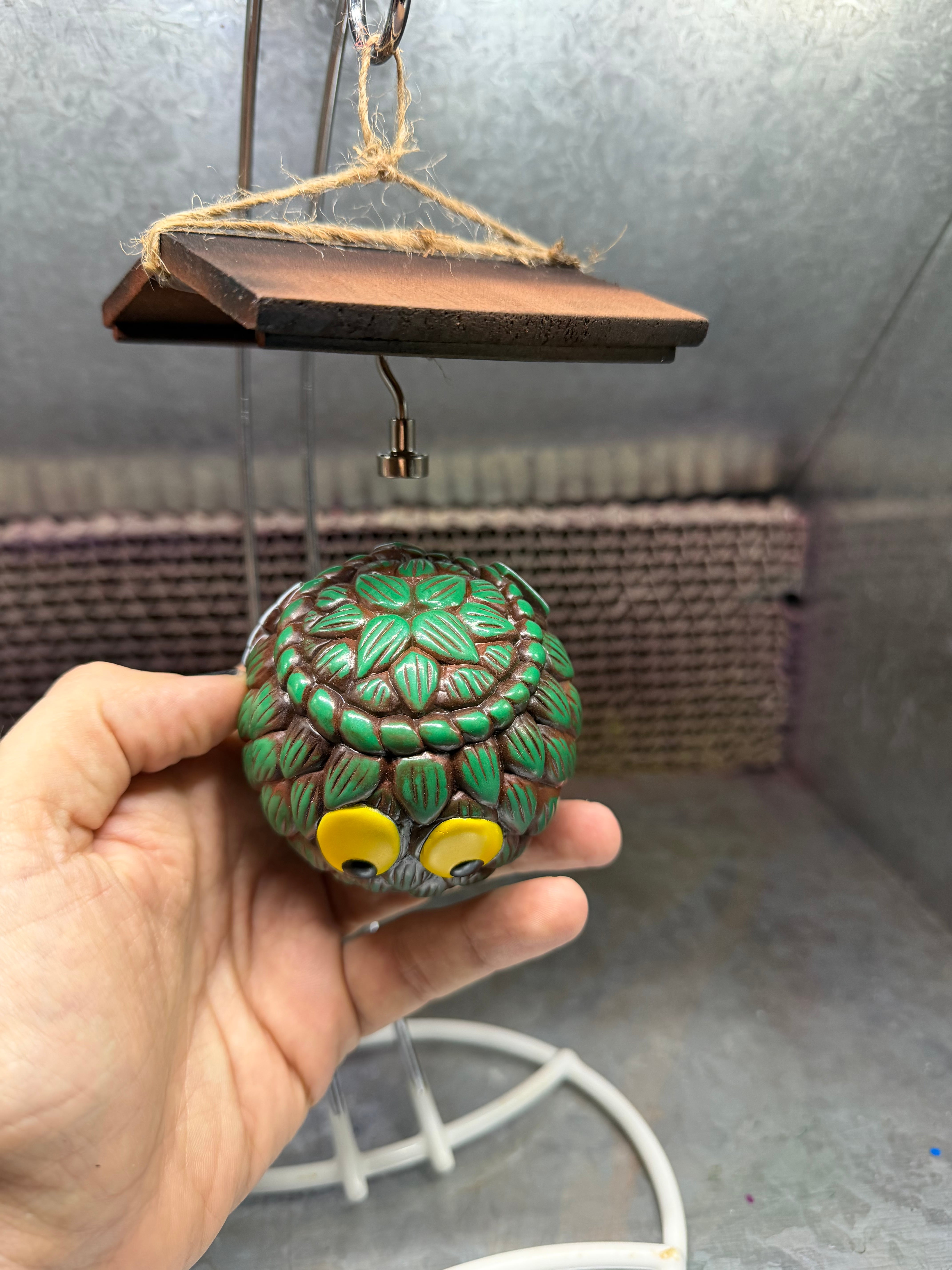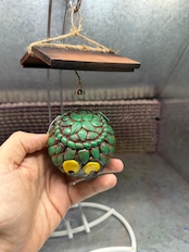 Sugidama is in dark green vinyl with a rub and yellow eyes. A magnet is installed inside and can easily attach to the magnetic hook. Which can be hooked onto the roof.