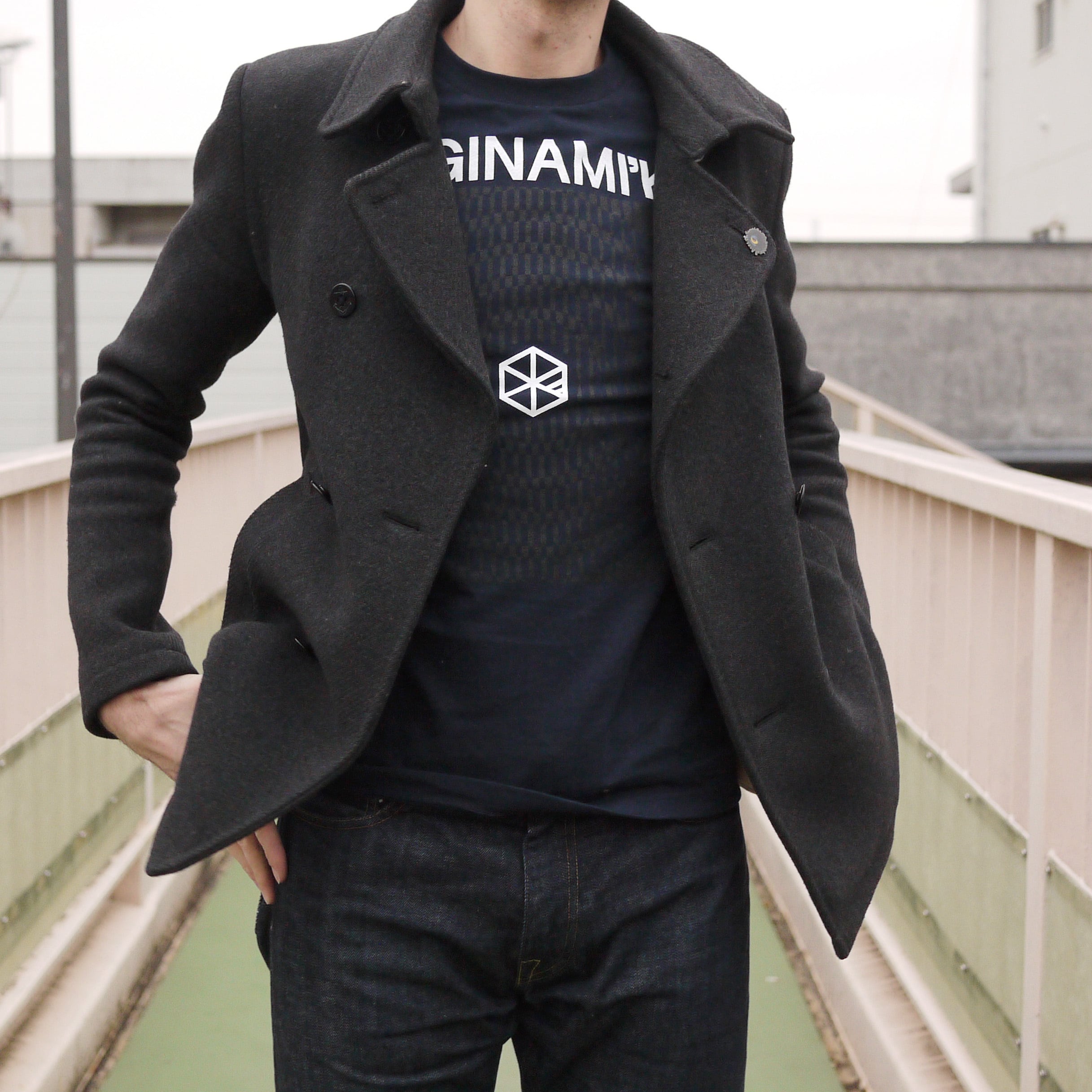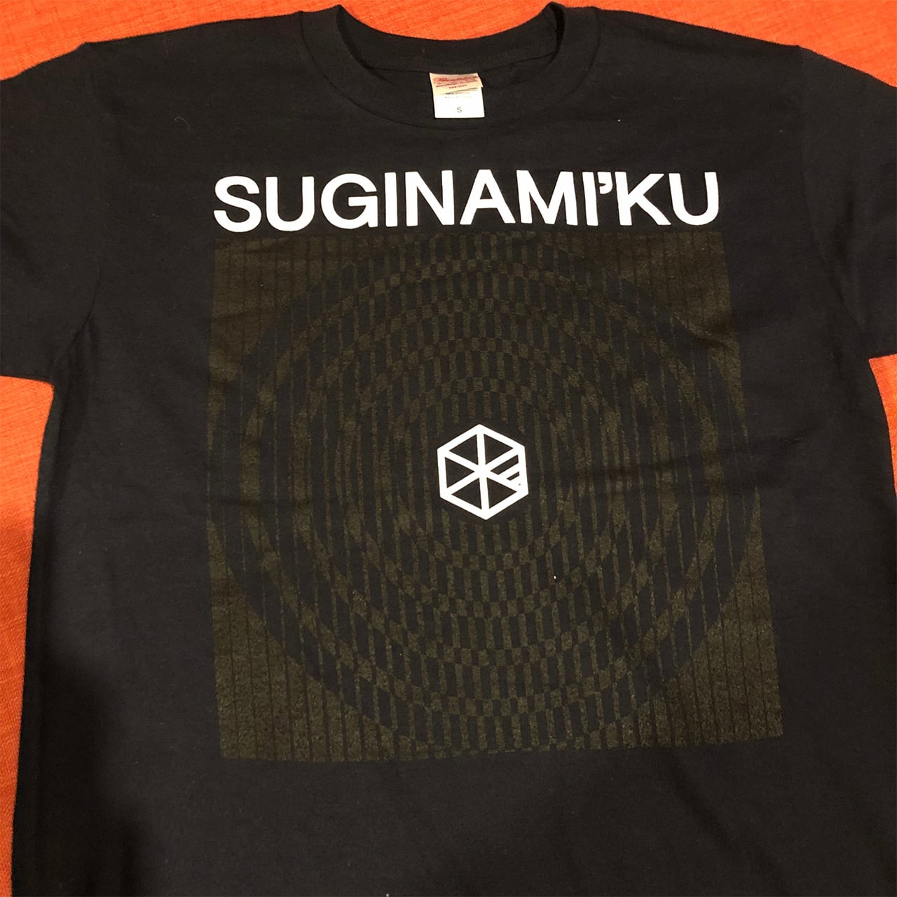 Boy do I love my neighborhood; Suginami-ku. Black and white ink on navy 5.6 oz Printstar 00085-CVT shirt. Short-sleeved.